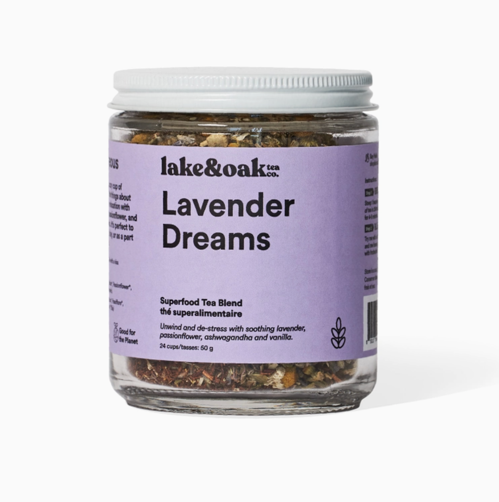 Clean linens, soft slippers and a cozy cup of lavender tea: a few of our favourite things about bedtime! Sip and soak up a little relaxation with this soothing blend of lavender, passionflower, and superfoods tulsi and ashwagandha. It’s perfect to soothe your nerves on a stressful day, or as a part of your nightly wind-down ritual.