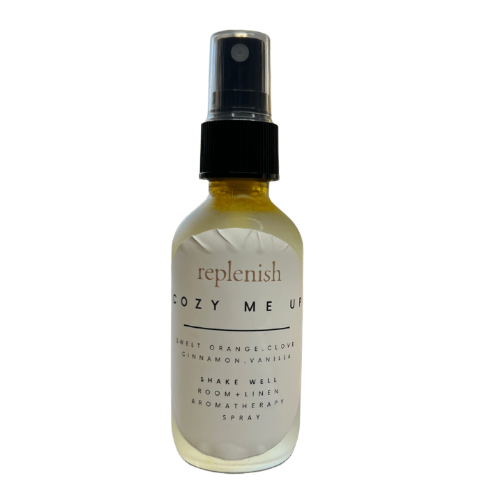 The winter seasonal essential oil spray is called "Cozy Me Up" like a warm hug curated in house and made with sweet orange, vanilla, cinnamon and clove. Pair this with our new replenish candle with complementary notes.